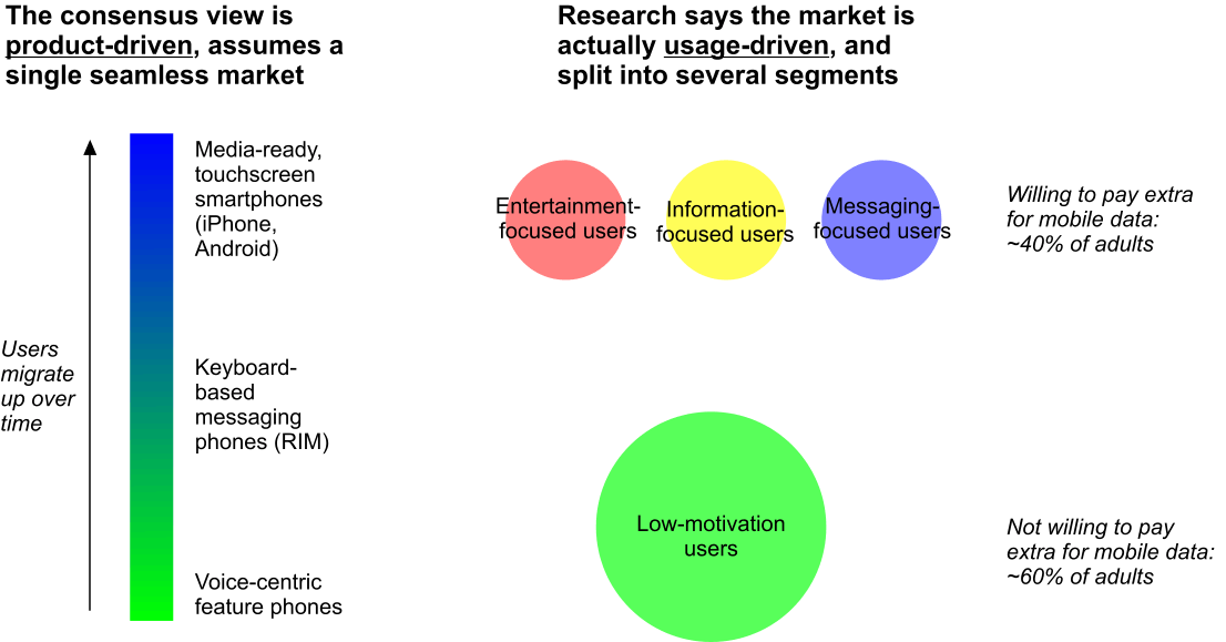 As I've written before (link), when I was at Palm we did a lot of research on mobile phone users in the US and Europe, and we found that about a third of them were willing to pay extra for new mobile data features in addition to voice and texting. Some of them were more interested in entertainment, some in business communication, and some in information management. These are the people who have been buying iPhones and BlackBerries.