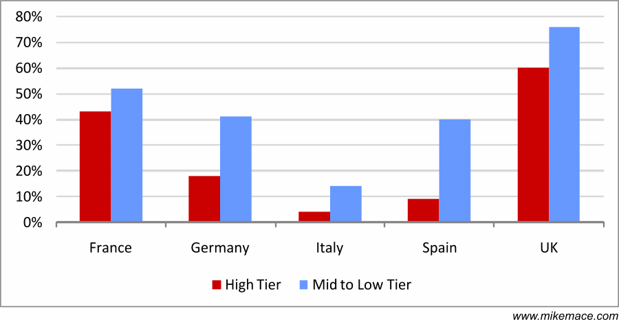Growth in data plans, 2010 vs. 2009. In all five countries, growth is higher in mid to low-tier plans (under 50 euros / 35 pounds a month). Source: Comscore (link)